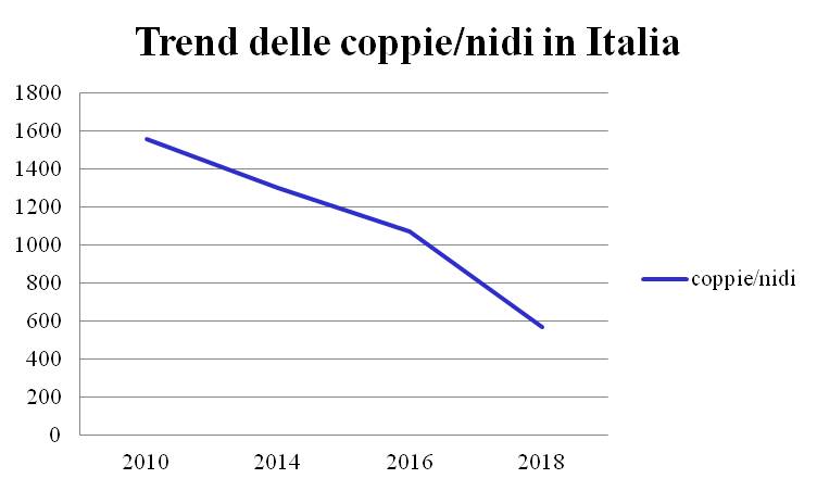 Rispetto alle stime delle popolazioni nidificanti elaborate per il periodo 2009-2010 (Biondi e Pietrelli 2011) i risultati dei censimenti evidenziano una forte riduzione nel Veneto (-68%) nel 2014 e in Sicilia (-84%) nel 2016, una riduzione in Toscana nel 2016 rispetto agli anni precedenti e una stabilità nella maggior parte delle altre regioni. Combinando i dati dei censimenti CNCF con quelli della precedente stima nazionale per il 2009-2010 per le aree e le regioni non coperte, la popolazione nidificante in Italia può essere stimata di 1.301-1.597 coppie/nidi nel 2014 e 1.072-1.281 coppie/nidi nel 2016.